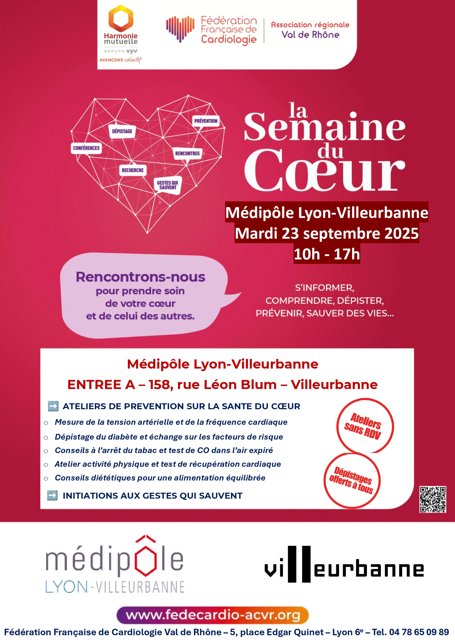 La Fédération Française de Cardiologie Val de Rhône initie et pilote tout au long de l’année des actions d’information et de sensibilisation : initiations aux gestes qui sauvent, journées de dépistages des risques cardio-vasculaires, conférences sur les thèmes de prévention.