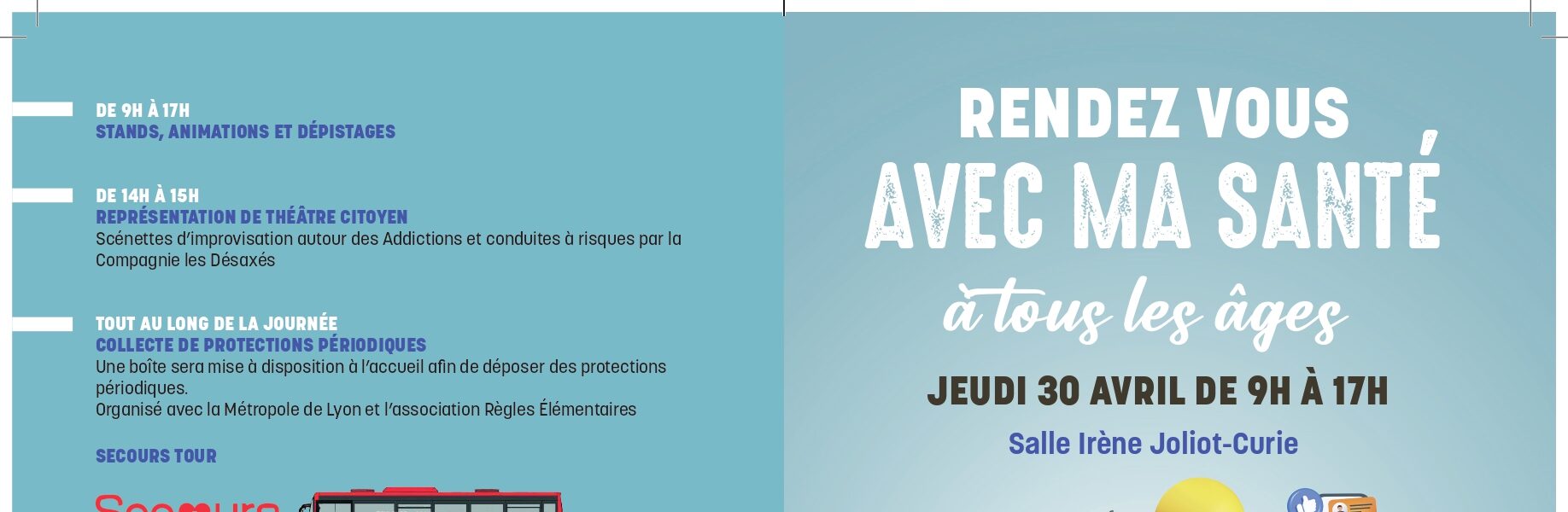Le camion du SECOURS TOUR de la Fédération Française de Cardiologie animera des ateliers de dépistages diabète, cholestérol, hypertension, échange sur tous les facteurs de risques cardiovasculaires et animera également des ateliers d’initiation aux gestes qui sauvent.